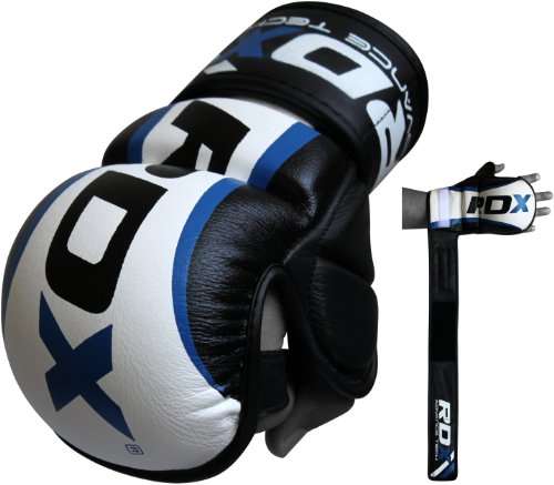"De Thumb boîtier 'RDX ultime combat hybrides Gants paume ouverte avec doigts cassés et ergonomiques" "enveloppe de pouce" "conçu pour le contrôle grappling ultime avec restriction minimale. La vache la plus exquise pleine fleur cuir de peau et rempli de« IMT »trois couches de gel padding intégré pour l'absorption des chocs robuste pour prendre les coups les plus difficiles. La meilleure qualité de cuir et professionnelle 3/4 "" rembourrage gel couches sur les jointures et le dos du poing pour tous les concours et de la formation professionnelle et amateur ergonomique conçue avec un cambrée unique et serré compartiment main apte à fournir un ajustement sûr et confortable. Construit en cuir de qualité supérieure avec trois couches de système de base de mousse de gel pour une excellente part, et la protection de la mi-cuisse et dispersement de choc. RDX faire partie de la meilleure formation MMA et des gants de concurrence sur le marché. Conçu spécialement pour les prises pour les athlètes de MMA, avec ses contours triple-couches de système de noyau de mousse sur les doigts du gant peut être utilisé pour des techniques saisissantes.