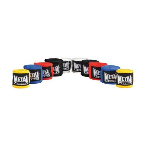 Bandes de boxe Metal Boxe. Bande de boxe amateur ou professionnel avec passant pour le pouce et fermeture par velcro. Largeur : 5cm. Longueurs disponibles : 250cm et 400cm. Coloris disponibles : Noir, Rouge, Bleu, Blanc.